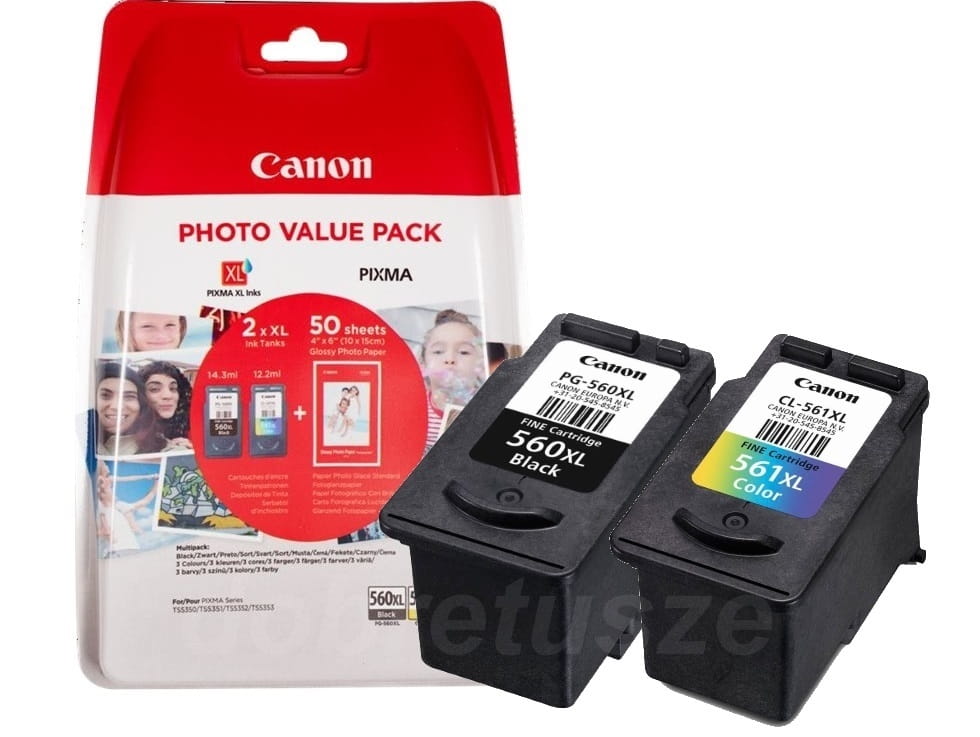 Komplet oryginalnych kartridży (czarny i kolorowy) o zwiększonej wydajności Canon PG-560XL i CL-561XL + papier photo - produkt fabrycznie zapakowany w oryginalne opakowanie przez producenta Canon.